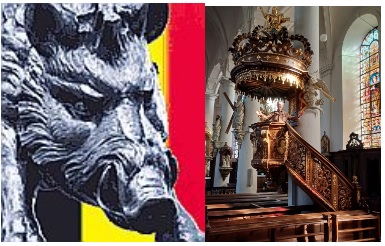 Links: het Groene Belg-logo als symbool van Belgische weerbaarheid: de ever van Martelange op tricolore achtergrond. Rechts: grappig symbolisch: predikend voor een lege kerk. De kroon boven de preekstoel van de Sankt Nikolauskirche van Eupen is wel een juweeltje van vakmanschap ! (foto Ren de Vree)