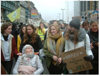 Klimaatbetoging Brussel 15/3/2019: Met oma op stap voor het klimaat: van links naar rechts de zussen De Wever, Kyra Gantois en - met het bordje, vermoedelijk - de Naamse Adelaide Charlier. (foto: jpe)